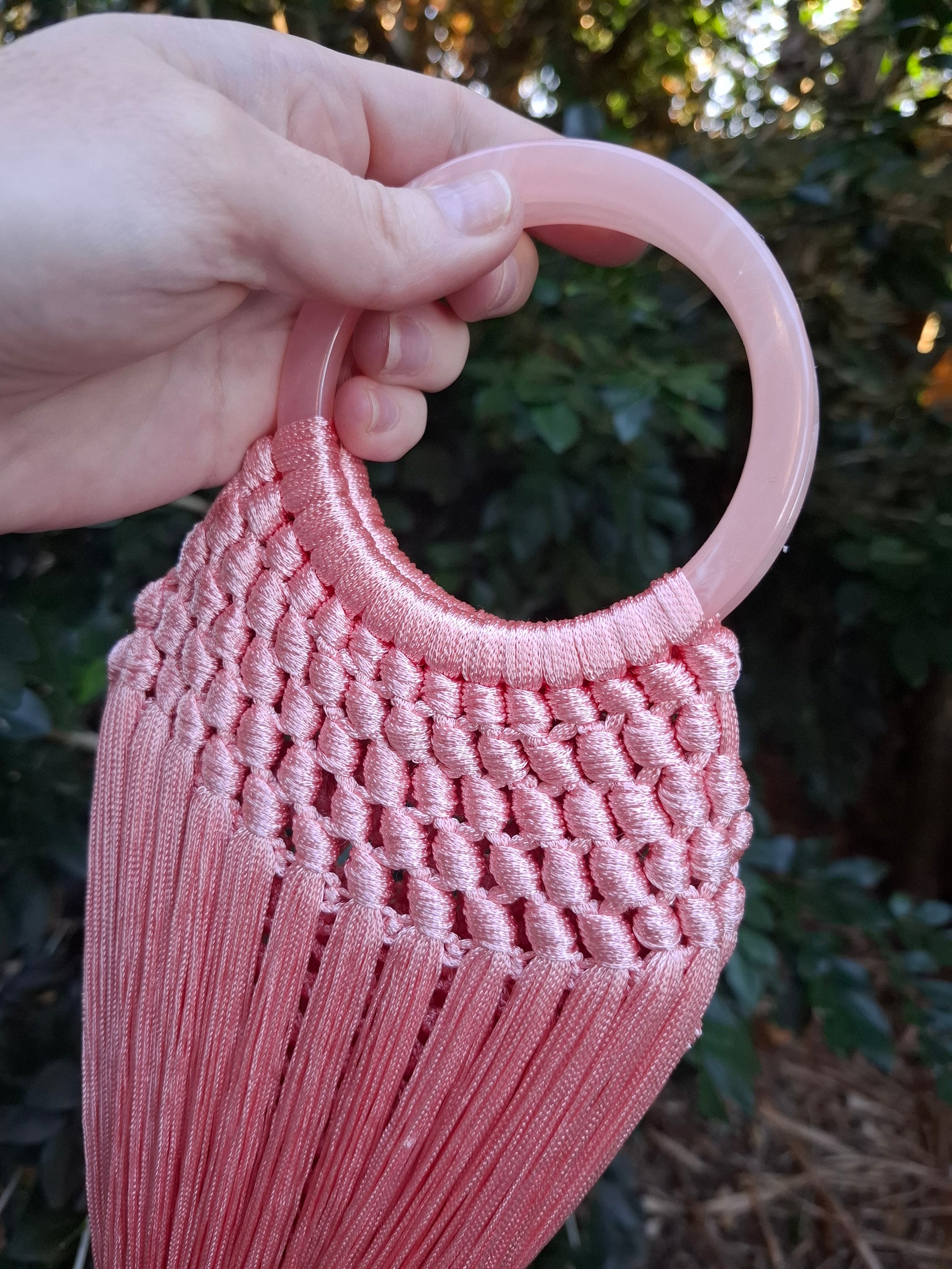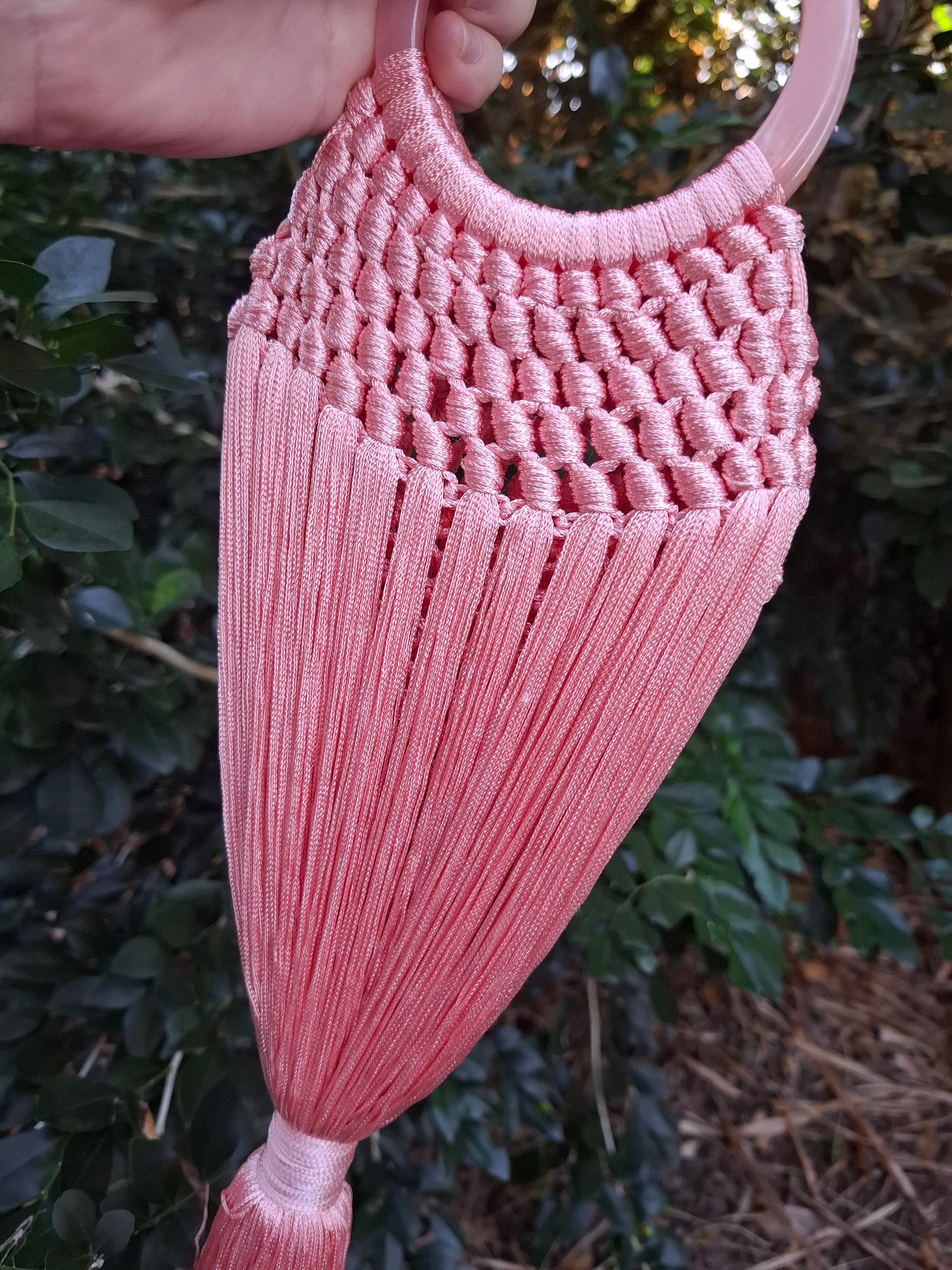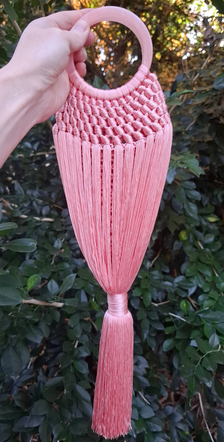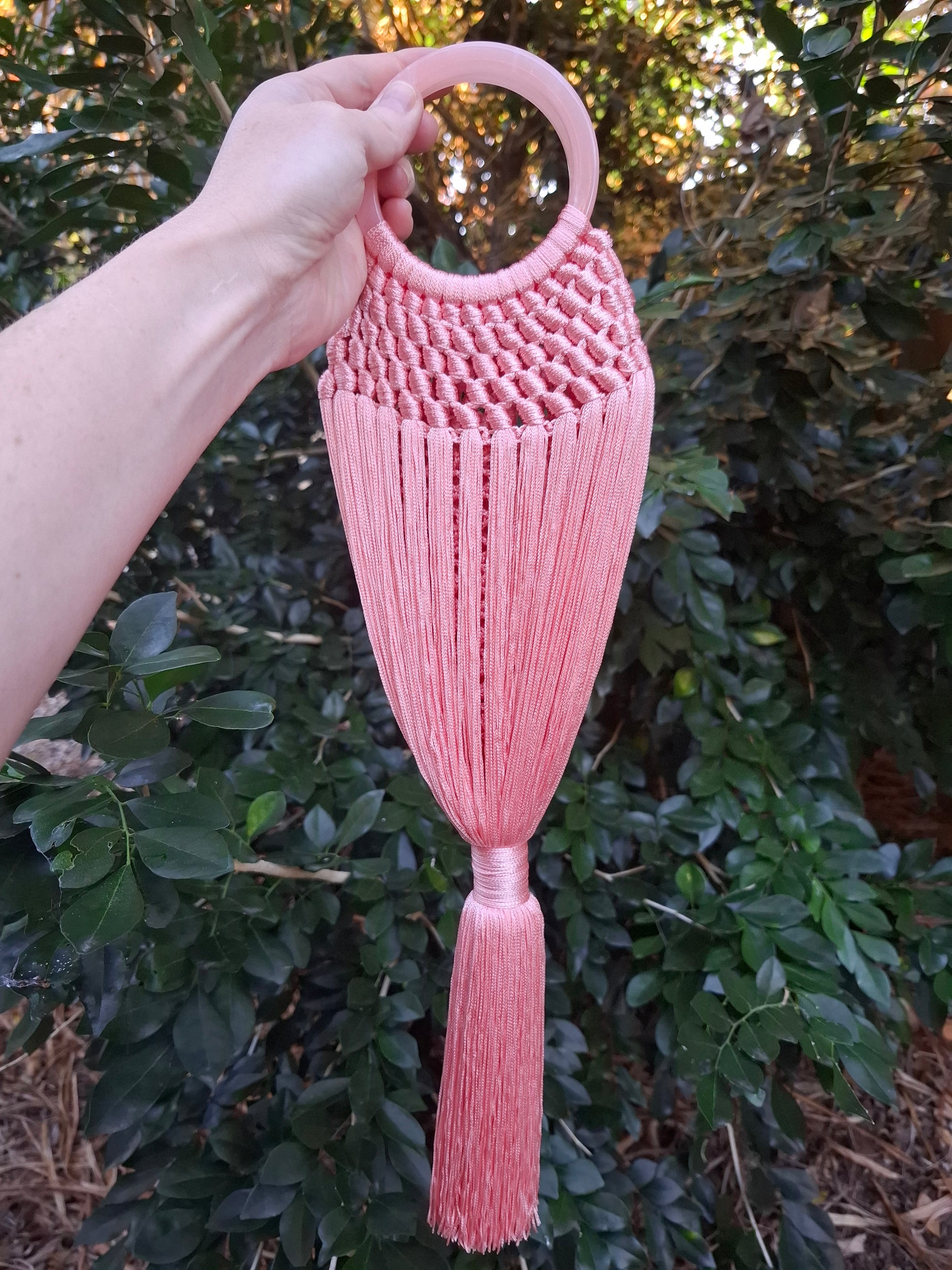 Atlanta is a stunning handcrafted macramay tassel bag. She features an acrylic bangle style handle. Quite roomy inside for the size. She will fit a phone and small essentials.