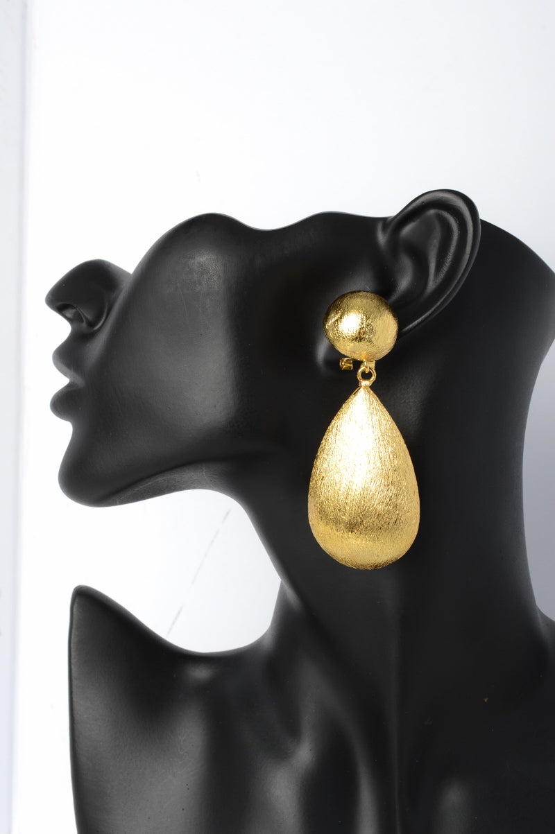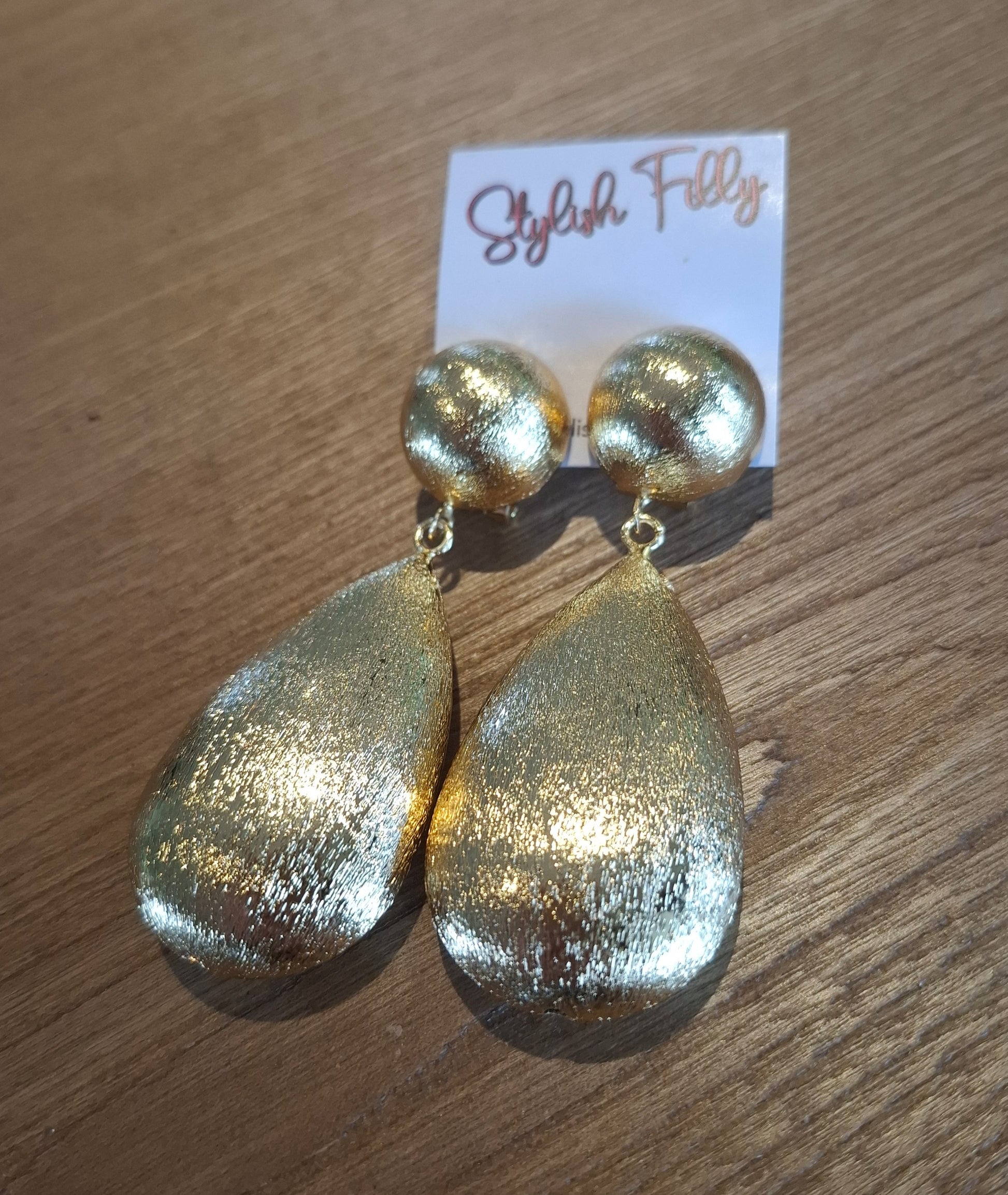 Aurella is a golden tear drop dangle statement earring. She is hollow to help with weight and has a flip clip back closure for ease of wearing.