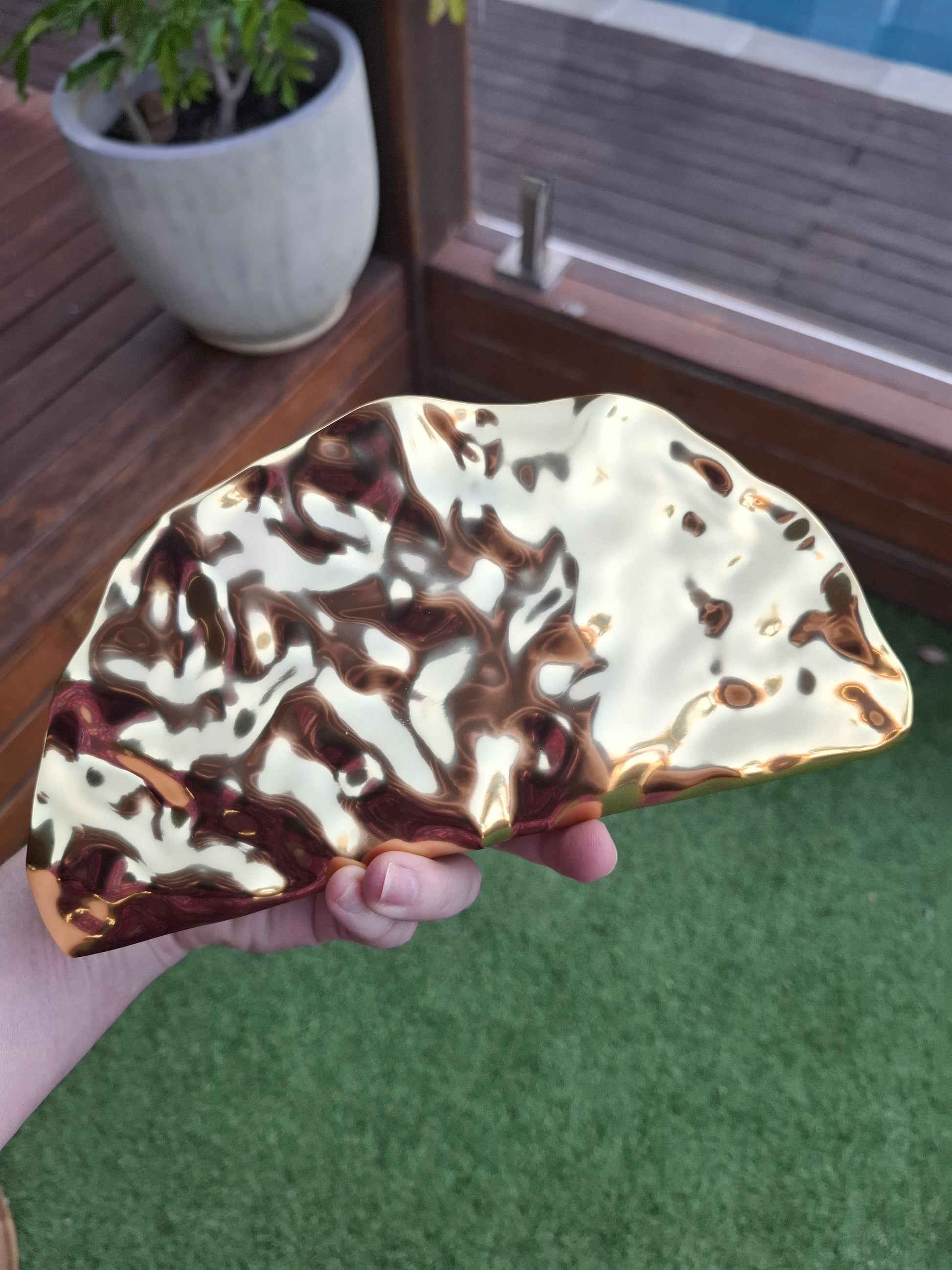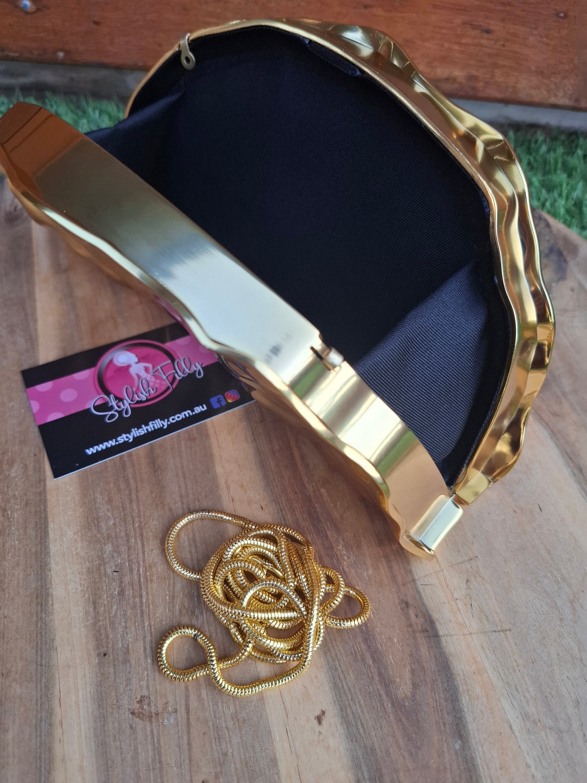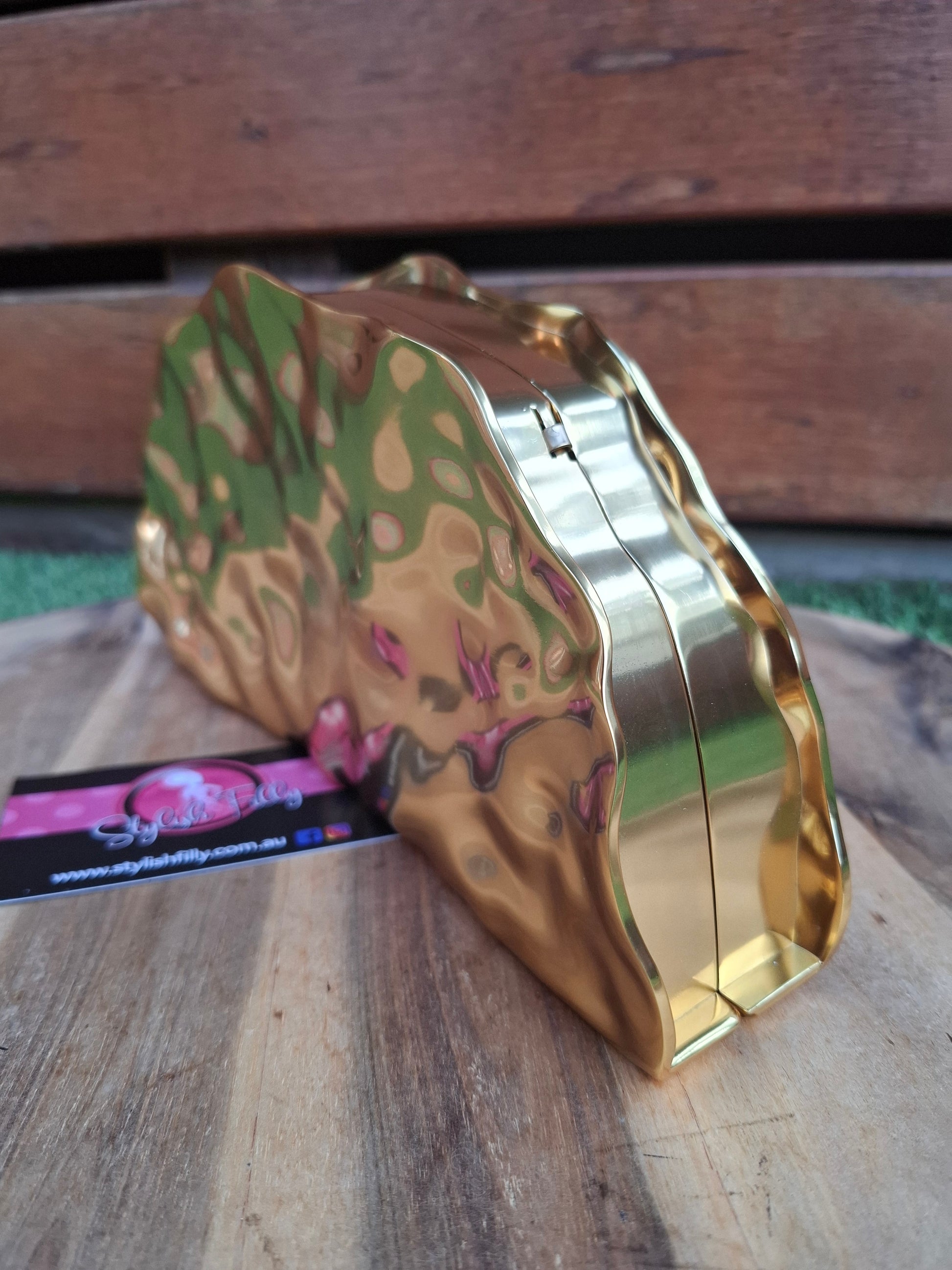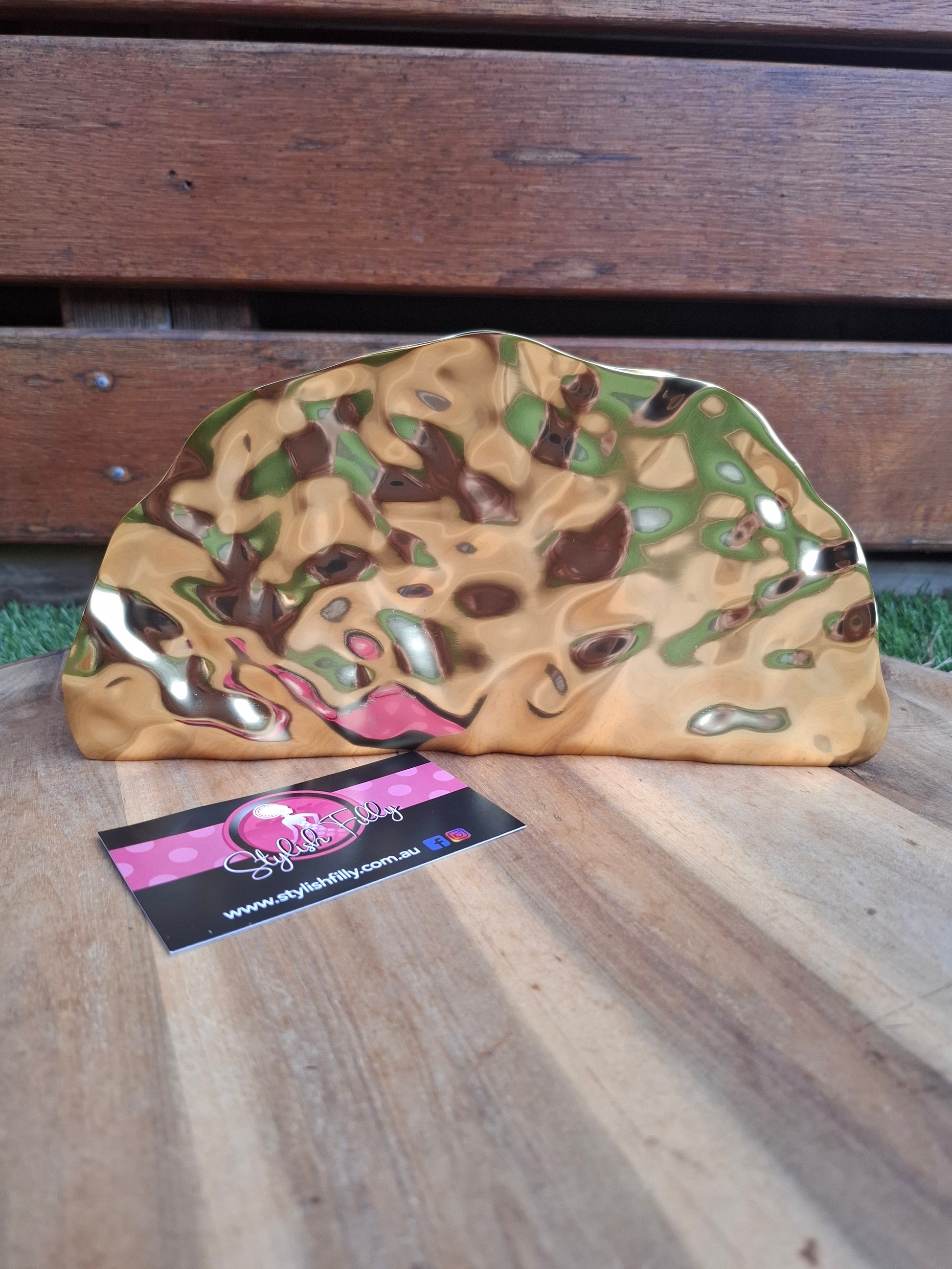 Candice is a golden fan "taco" dimpled metallic clutch. She comes with a long shoulder chain. She will be an absolute staple in your wardrobe.