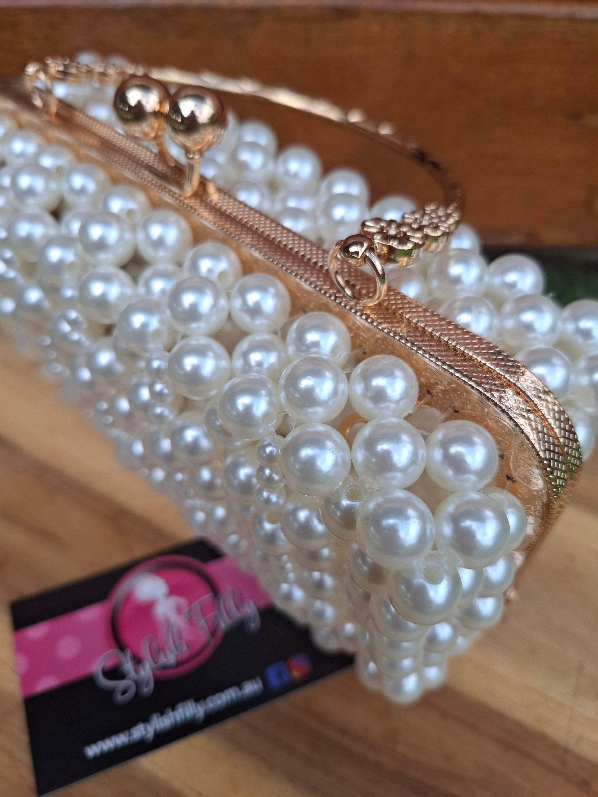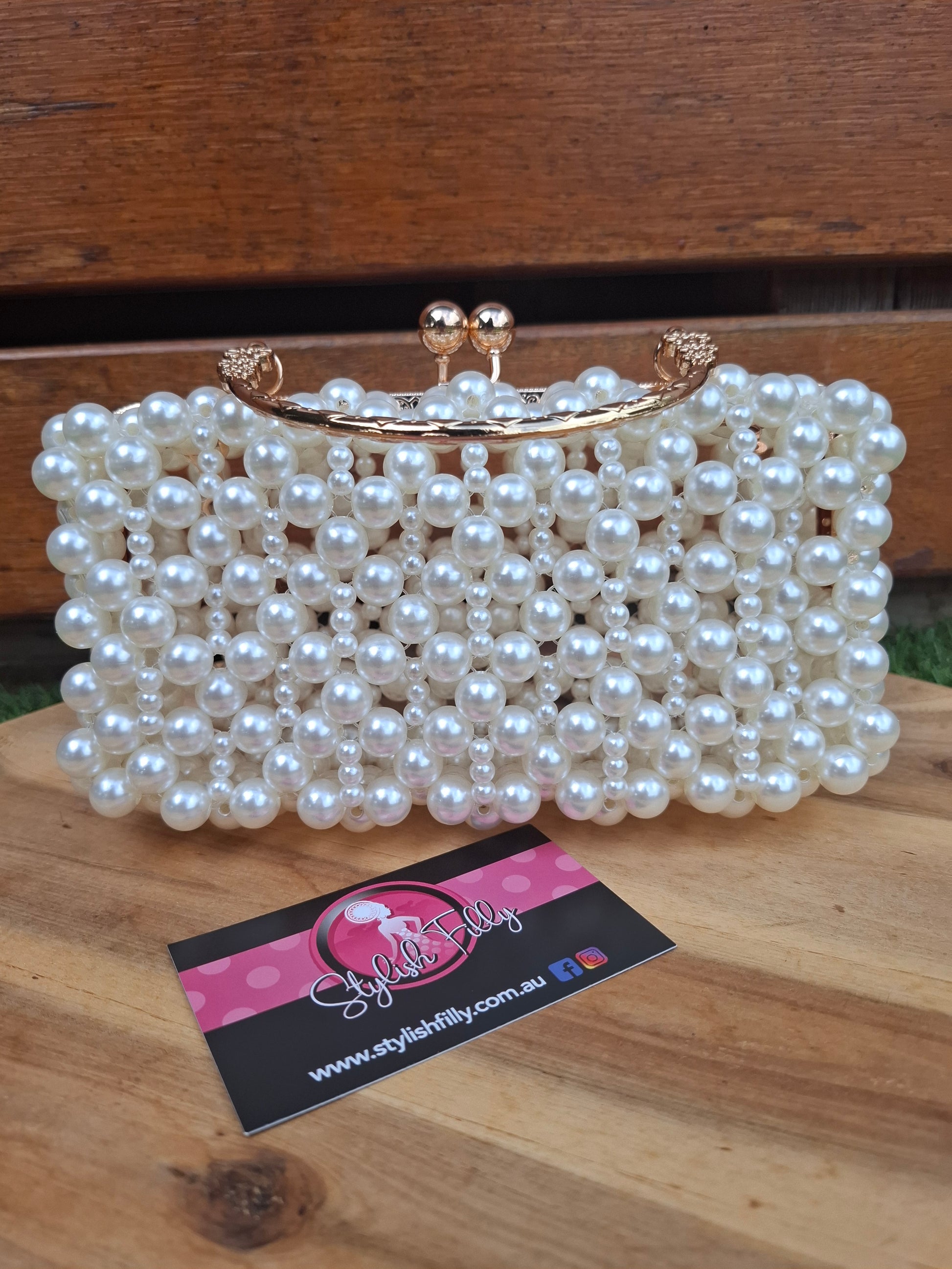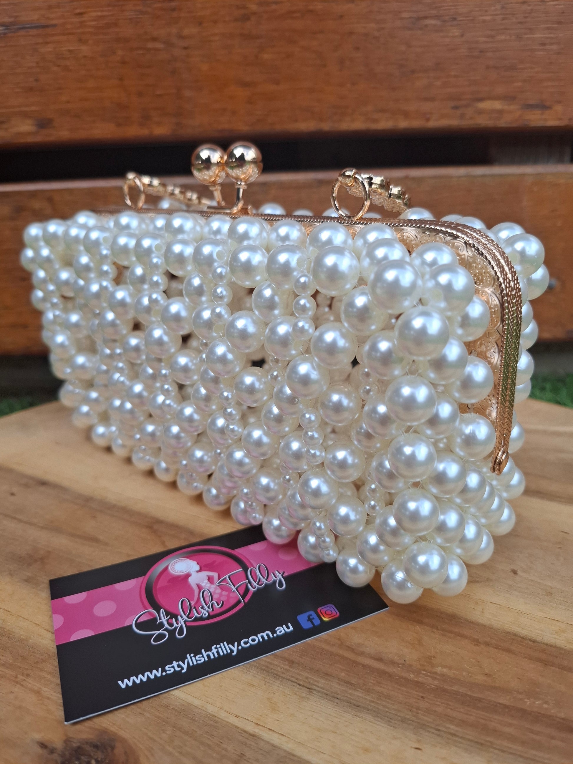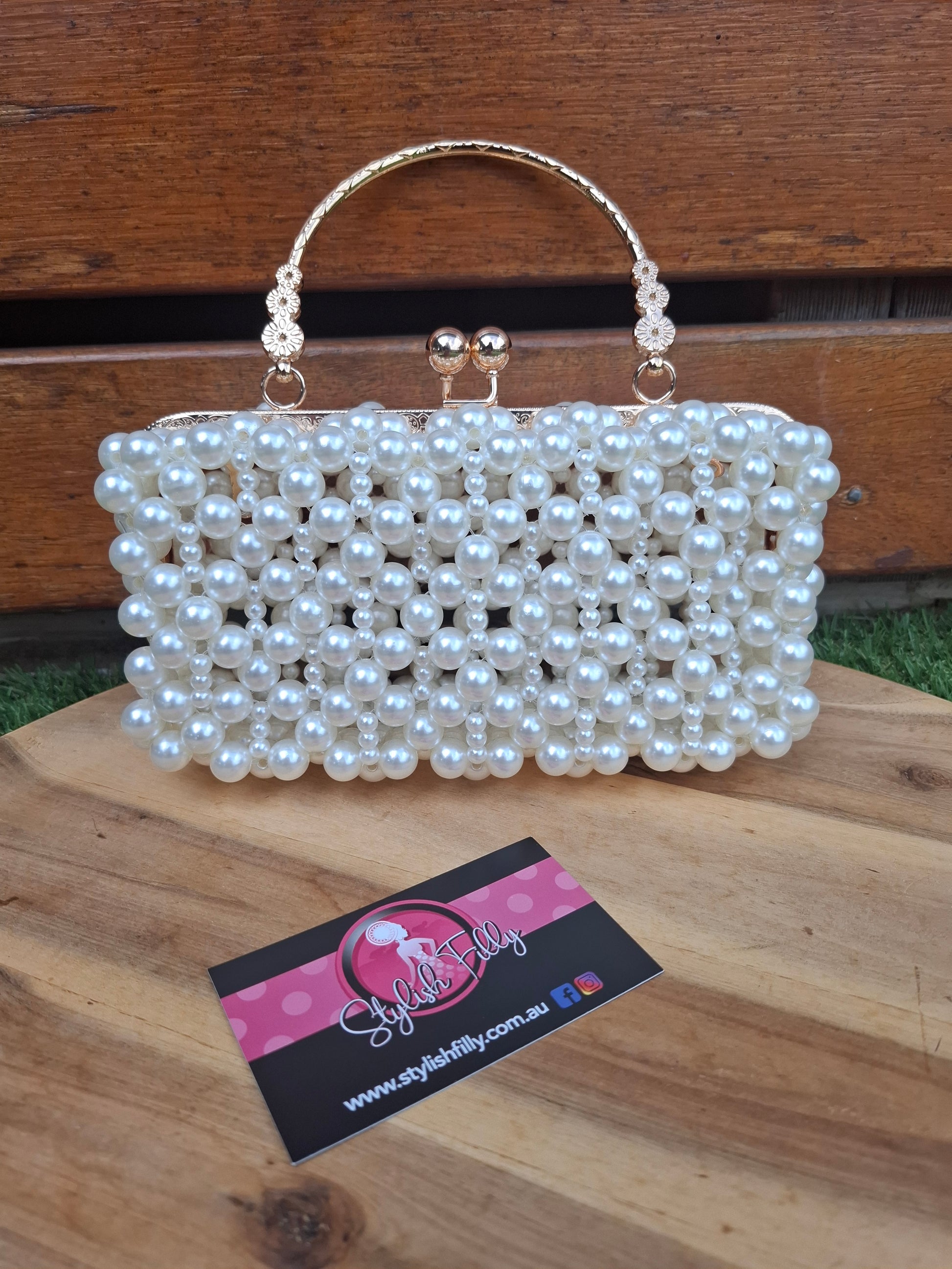Gwenith is a hand crafted varying sized pearl vintage style bag. Golden clasp closure and top handle.
