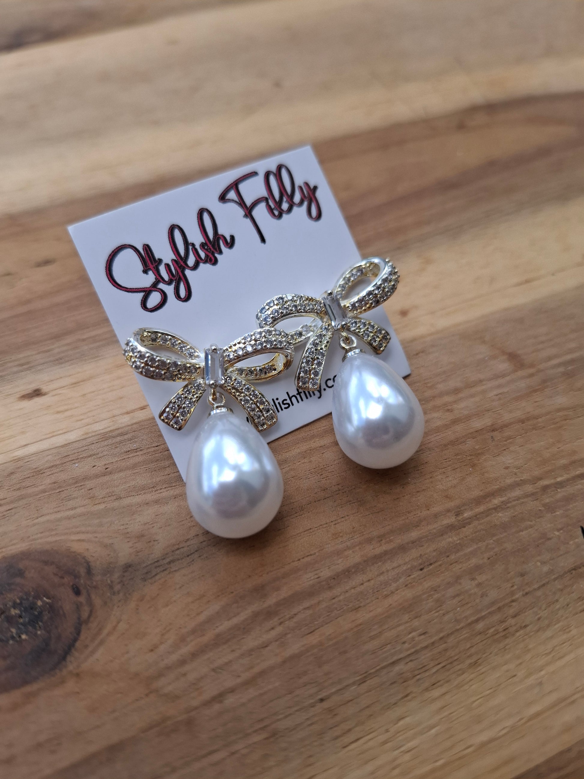 Jordie is a cubic zirconia encrusted sweet bow stud with tear drop faux pearl dangle.