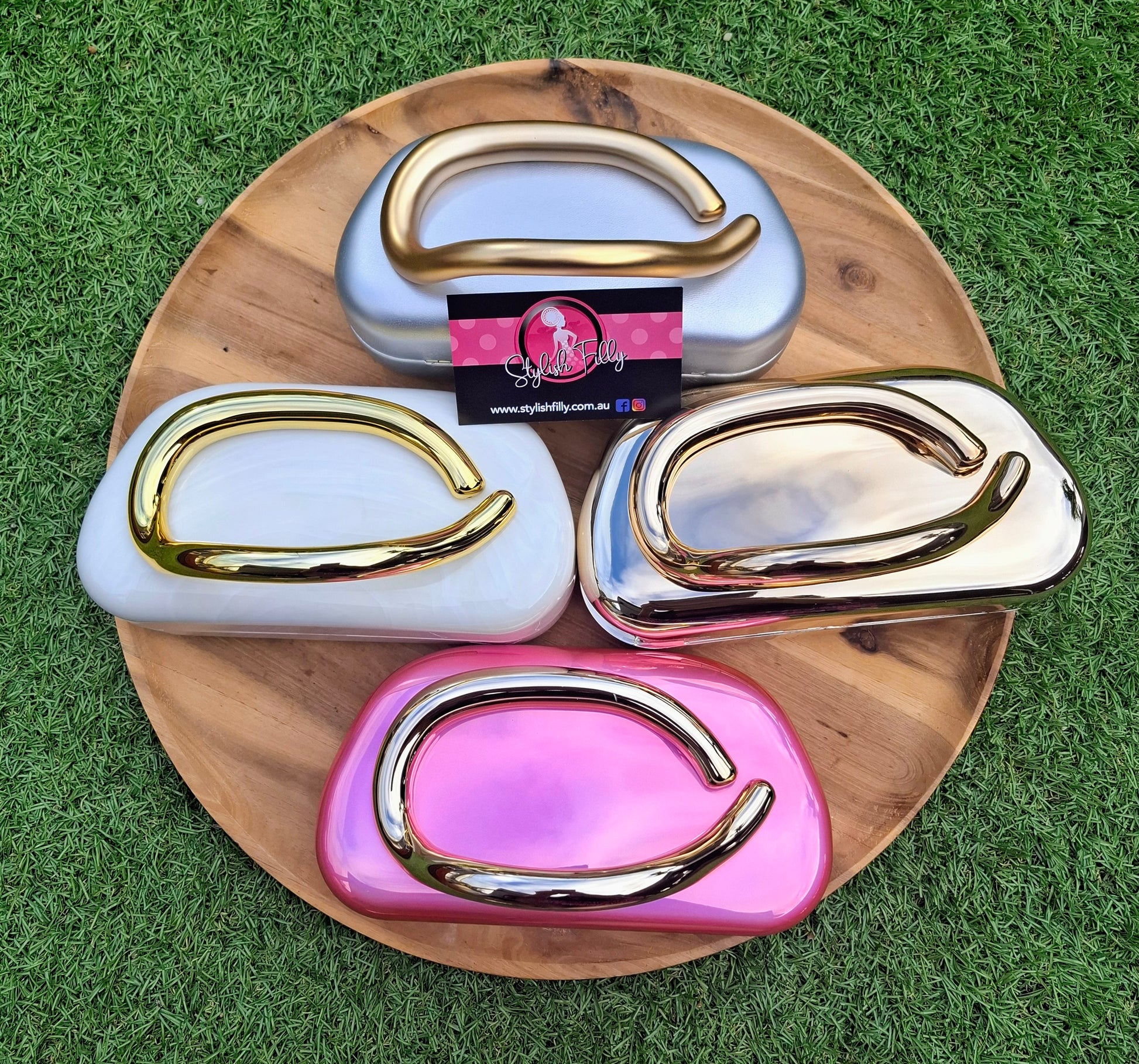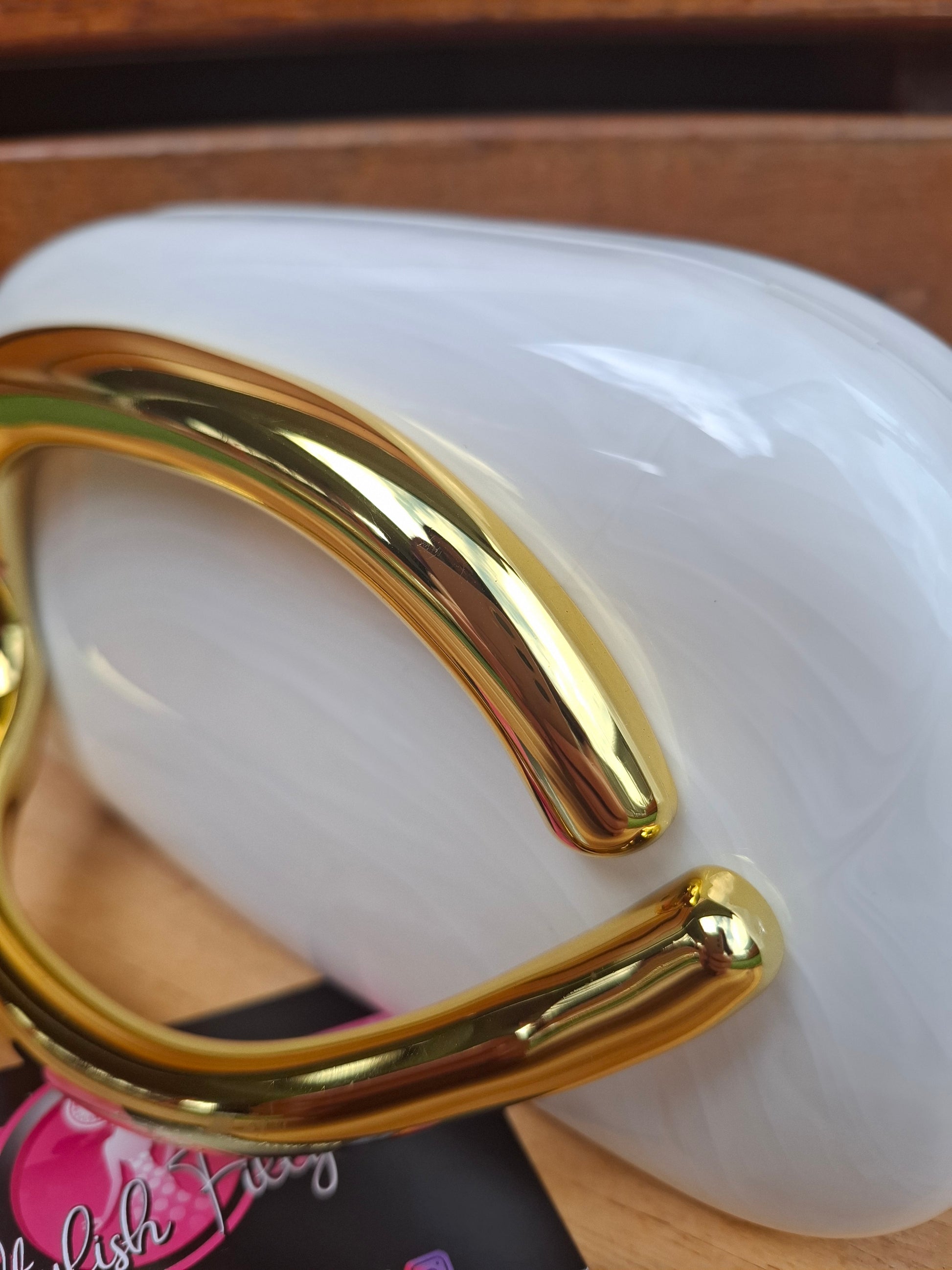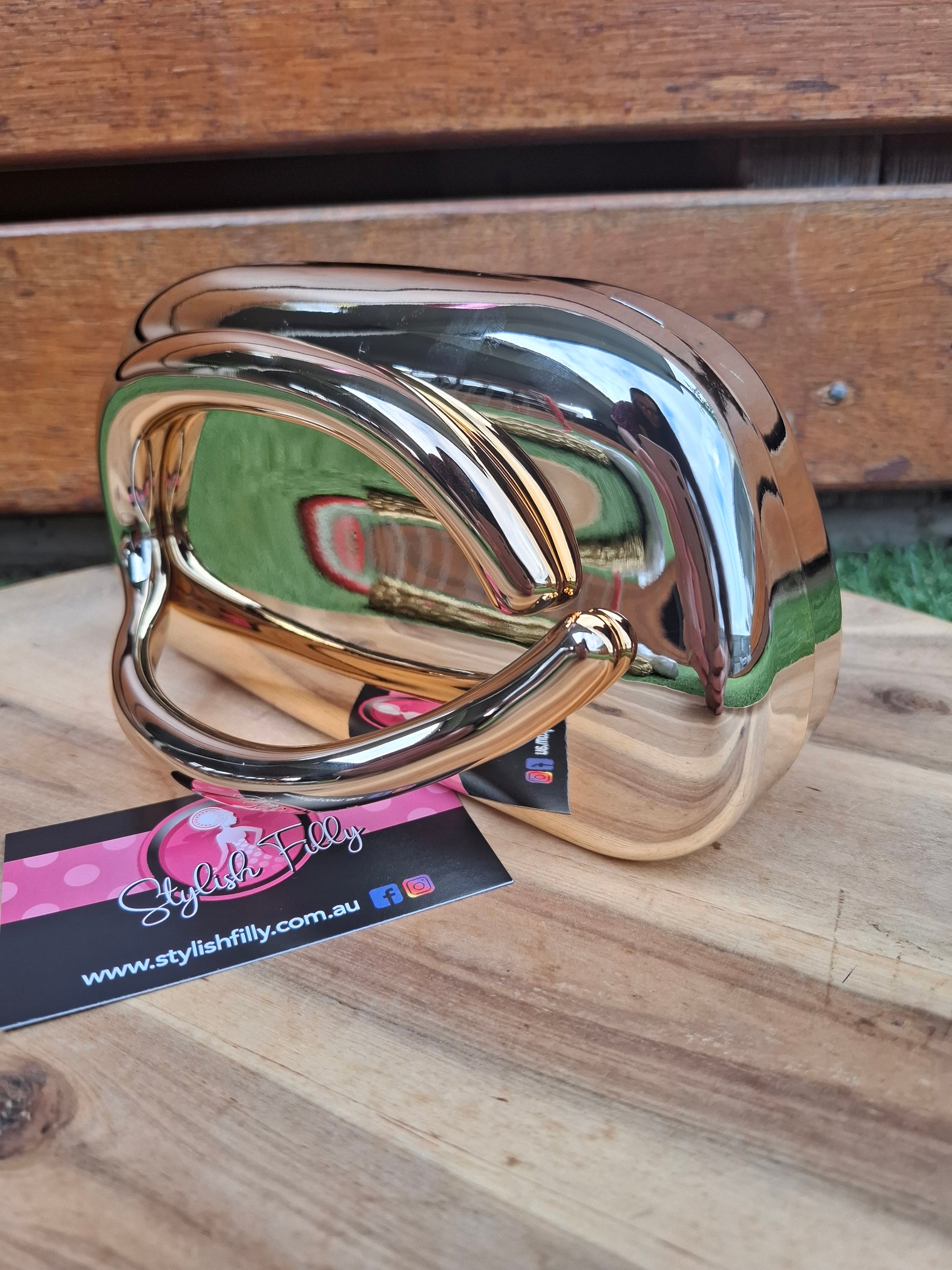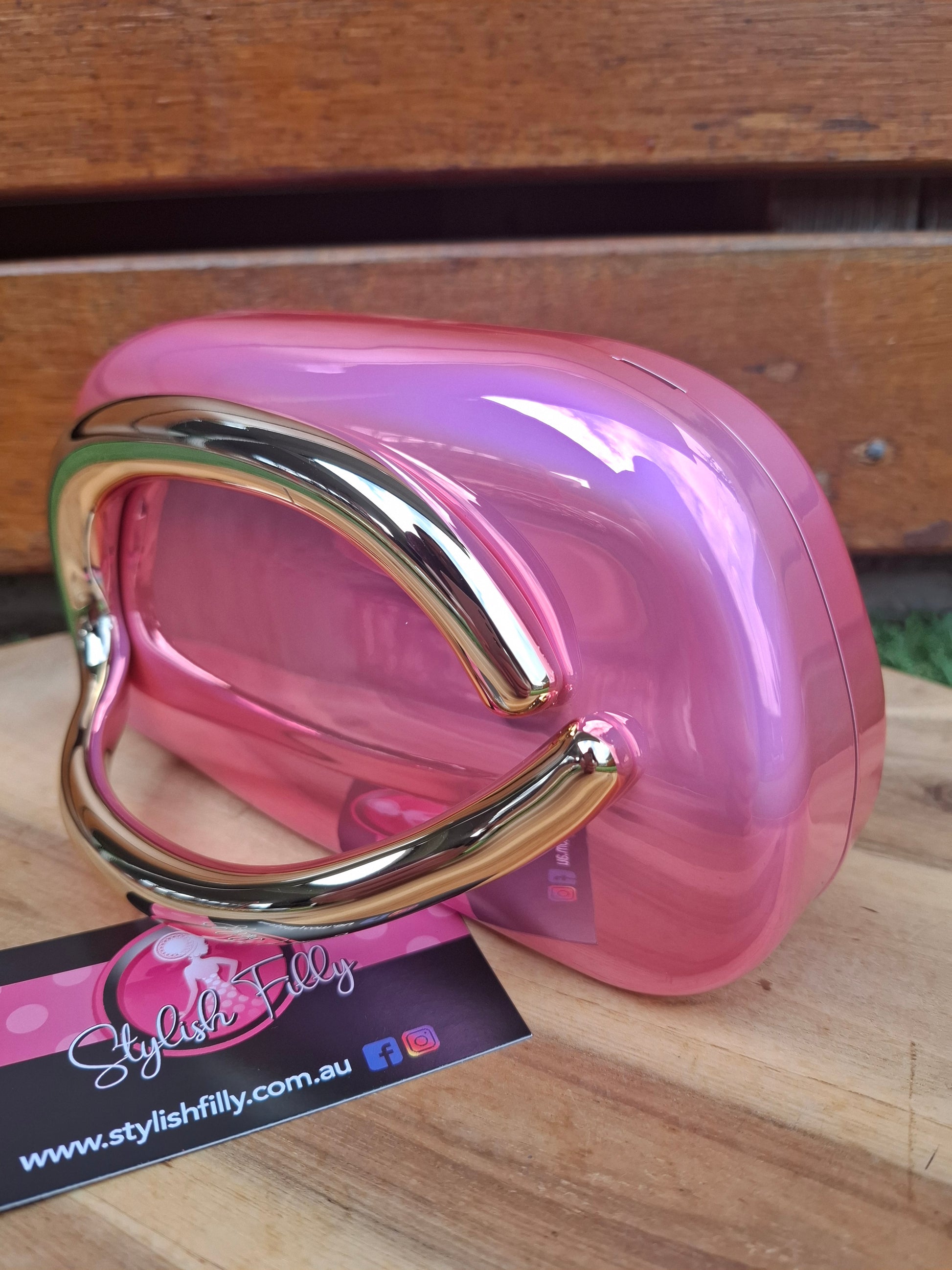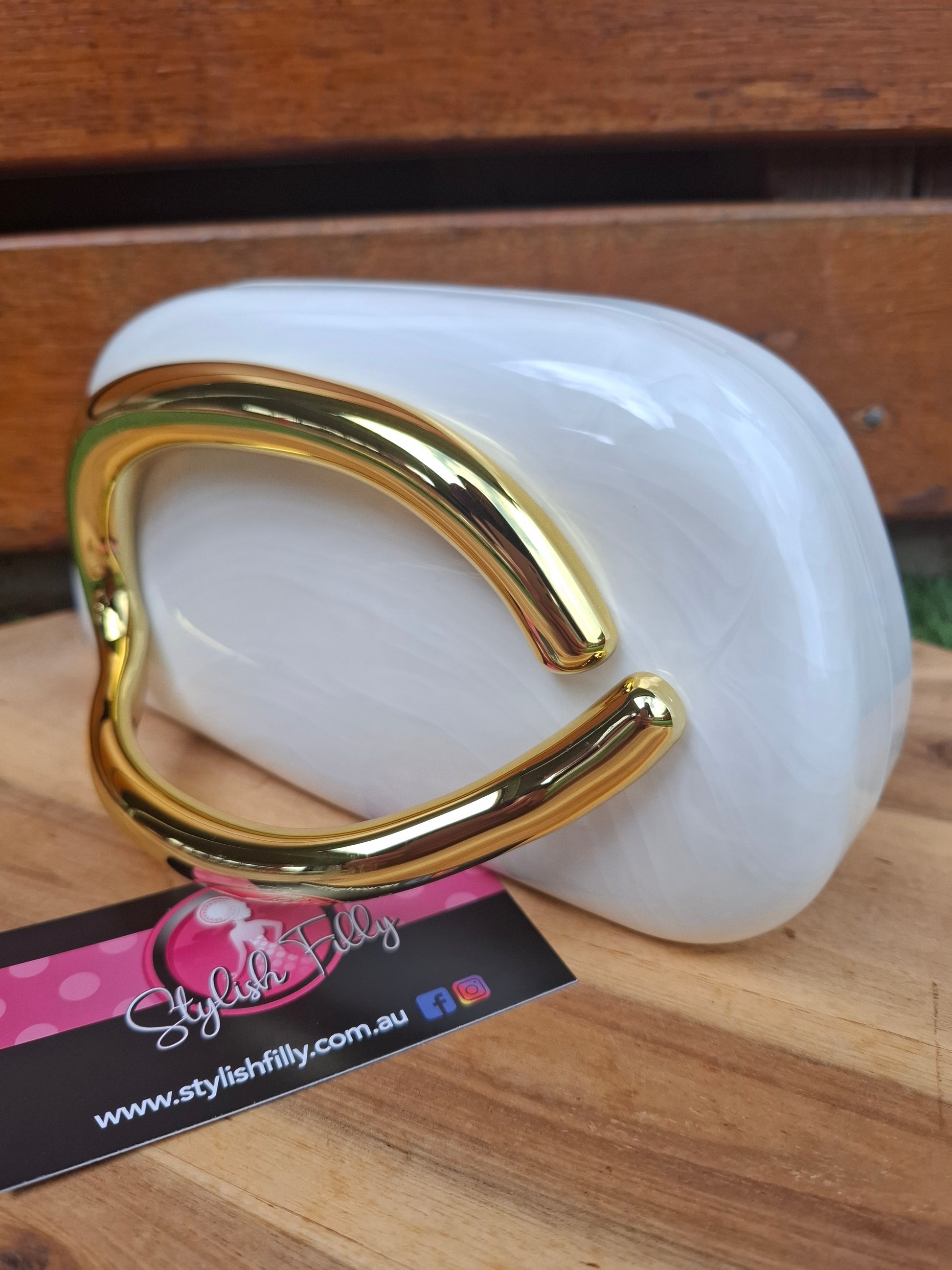 Portia is a modern contemporary acrylic clutch with a golden side handle feature. She comes with a long snake style chain.
