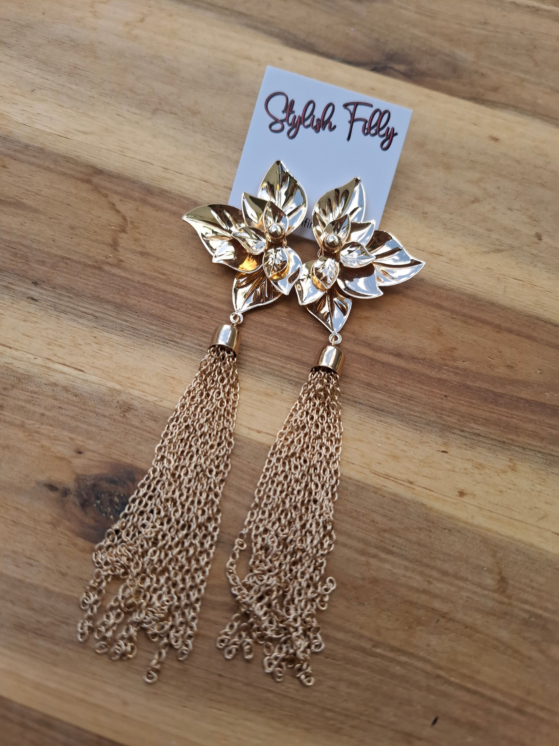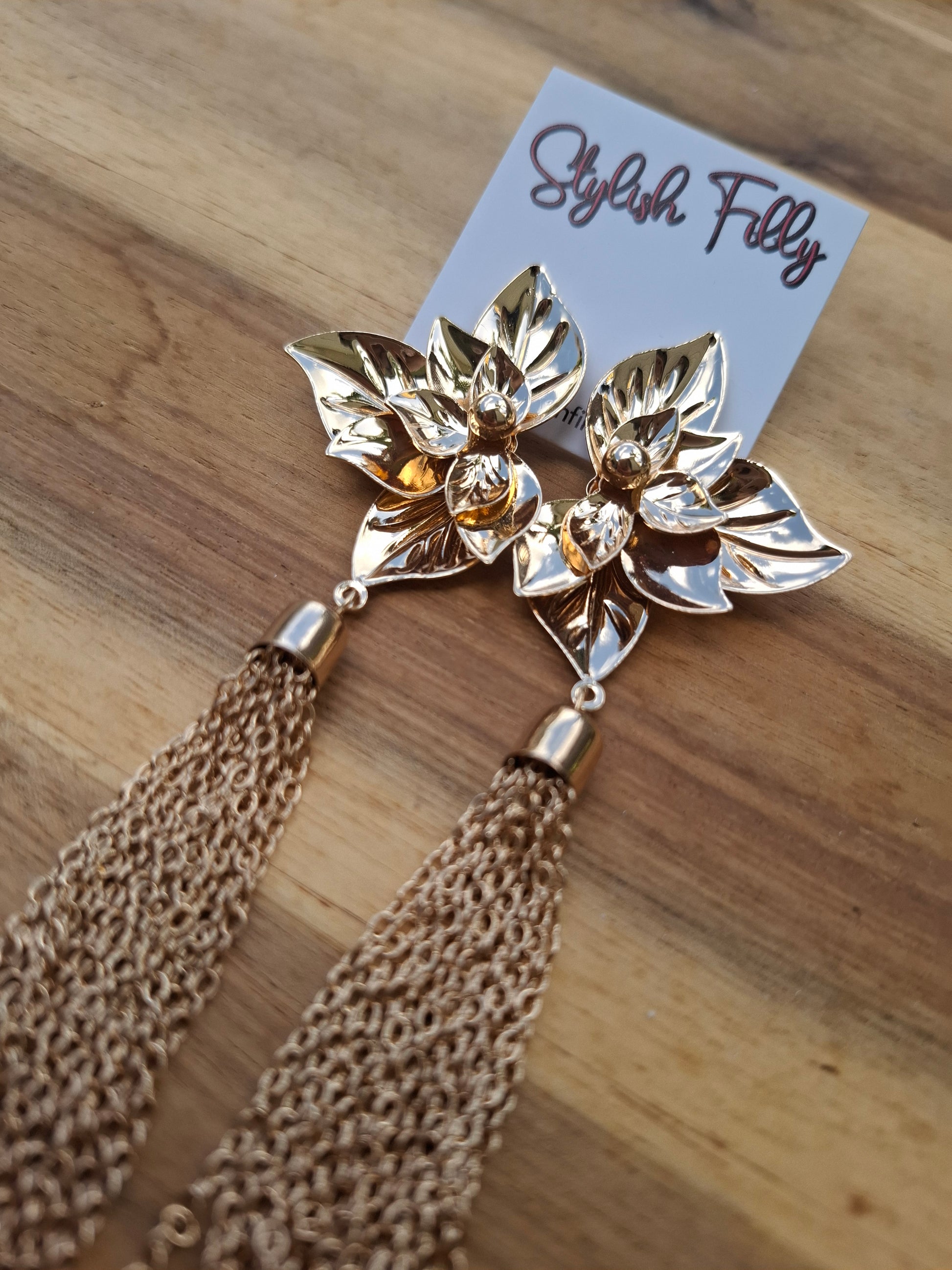 Sally is a gold 3D flower stud wth fine chain tassel dangles.
