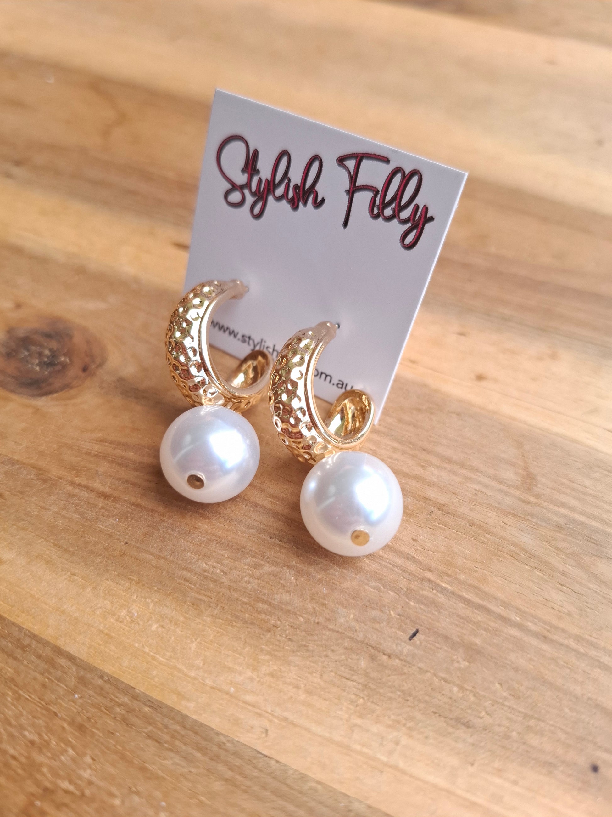 Saski is a gold stamped huggie with a faux pearl dangle.