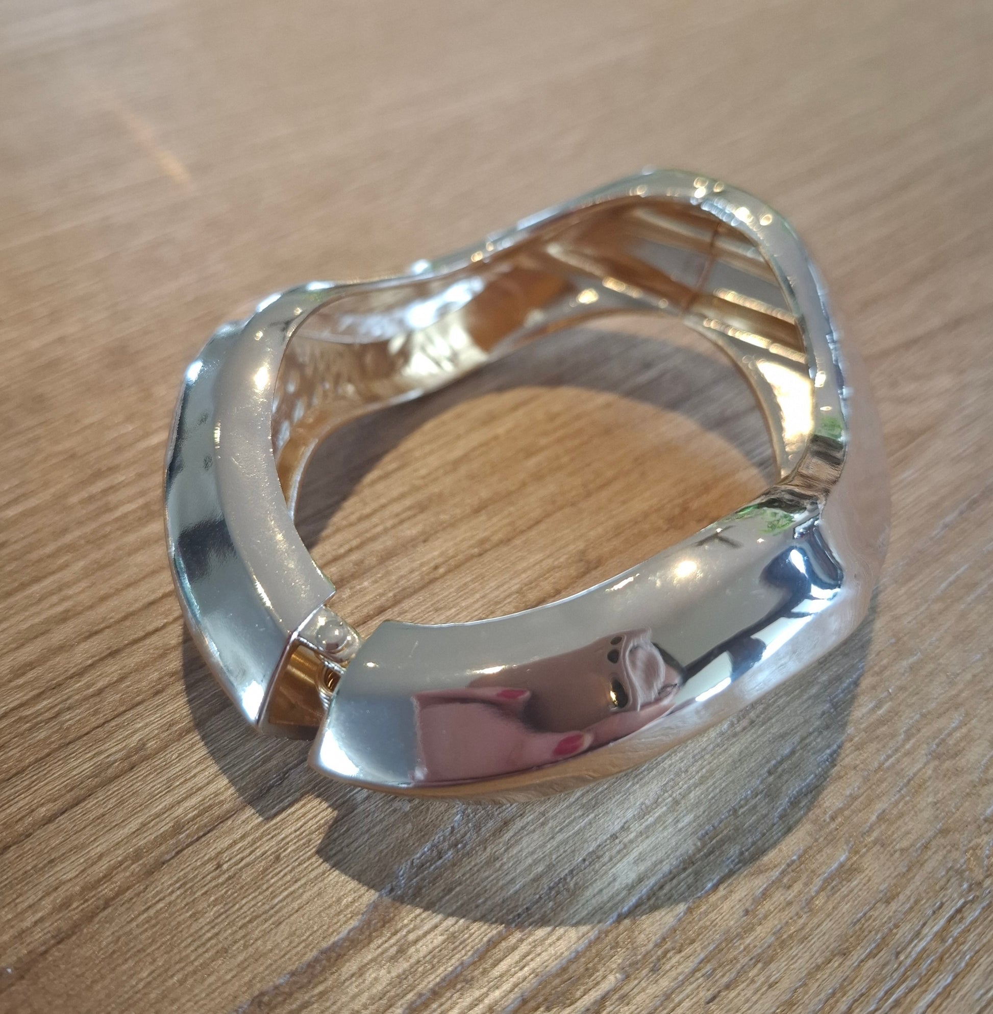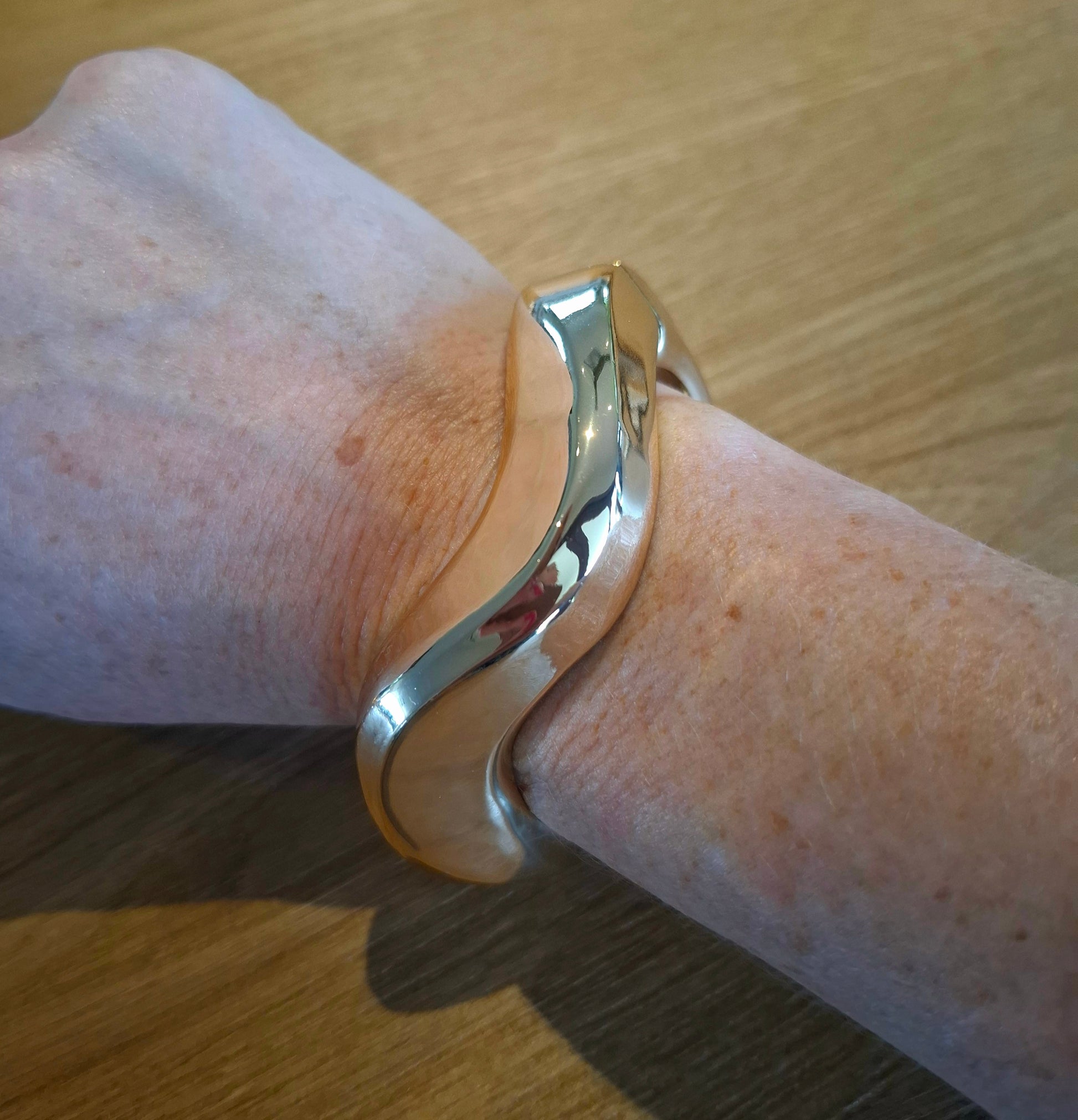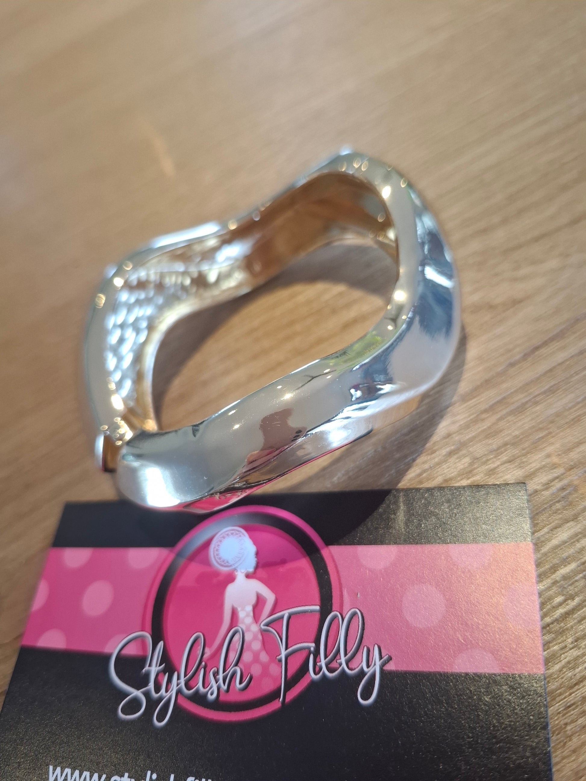 Ziggy is a solid metal gold hinged cuff bangle in a waved design.